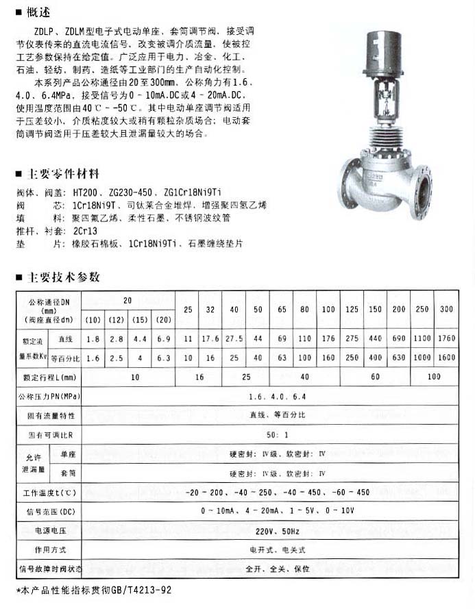 本系列產品公稱通徑由20至300mm.公稱角力有1.6、4.0、6.4MPa,接受信號為0-10mA.DC或4-20mA.DC.使用溫度范圍由40C--50℃.其中電動單座調節閥適用于壓差較小、介質粘度較大或稍有顆粒雜質場合:電動套筒調節閥適用于壓差較大且泄漏量較大的場合。